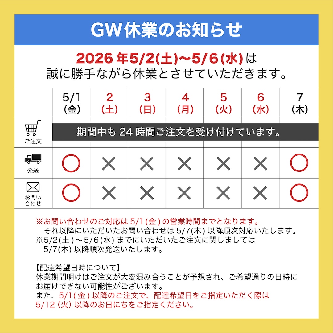 それ以降にいただきましたお問い合わせは5/7(木)以降順次対応いたしますが、休業期間明けはご注文、お問い合わせの混雑により、通常よりご回答にお時間を頂戴する場合がございます。
